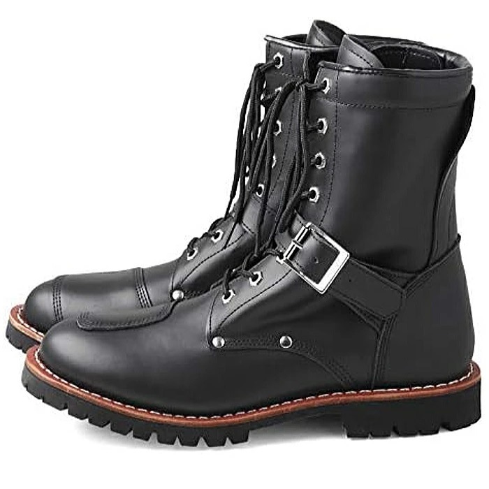 光沢のある牛革を使用し、レースアップとアンクルストラップを採用したハードなモデルです。