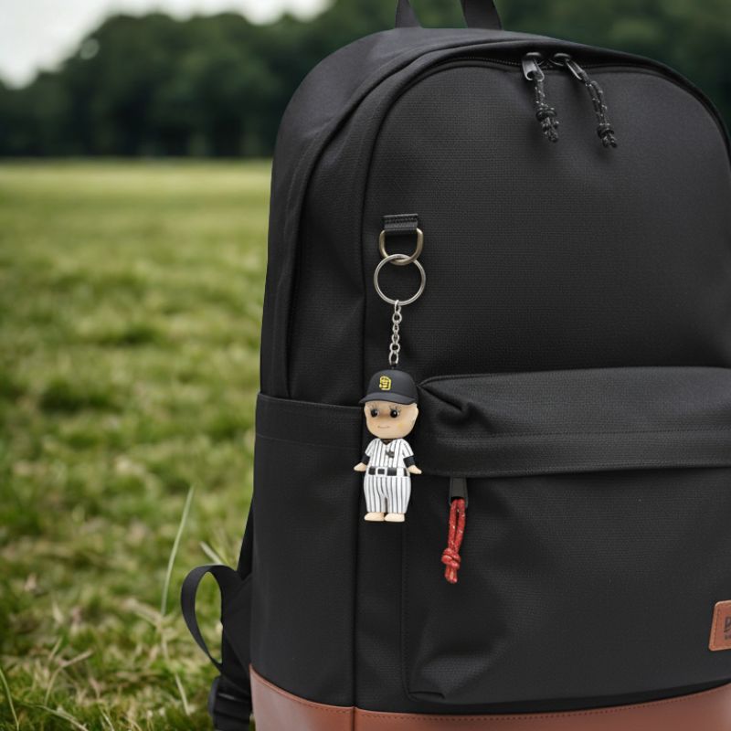 サンディエゴ・パドレスのユニフォームを着たキューピー人形が、持ち歩きに便利なキーホルダーに。
